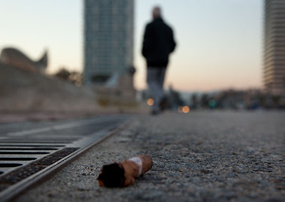 Finally I have the work to hand in for this assignment. It has taken me forever. Mainly as I decided to make the work I am currently doing with photographing strangers on the street smoking, fit the project. This has not been easy. It has meant I am not totally in control of every situation. I obviously don't have a studio set up. I thought a lot about how I would show each of the four categories: shape, form, texture and colour. A few weeks ago I convinced someone on the bus to be a model in an abandoned car park for an idea I had in my head. To work with I had a flash on a stand, some gel and a reflector. Also ambient light. Shape I decided to do in the most obvious way, a silhouette against the night sky. Texture and form I wanted to make use of the brick walls and broken fence in the car park. Colour I had in my head this idea of making the smoke blue and the smoker dark and moody. To do this I had a sheet of blue gel and an off camera flash. This took forever to get to work. I was on the brink of abandoning it. Why did I set myself something so difficult. However going back to my books. Trying to understand the angle of the light how to ensure it would be exactly where I wanted it when it fired. (No wonder hot lights are used in a studio, you know what they are going to do before they shot!) I talked to other photographers, I researched on the web. How do I get the light to just hit where I want. In addition the slightest bit of wind and the smoke would go in a different direction. My first attempts had eerie blue eyes burnt out forehead or spooky blue hands. Finally I worked out I need less gel, just a small sample gel taped across the flash. I had tried making a snoot to direct the light but that didn't colour all the smoke. What I did was change the zoom of the flash. Something else I have learnt. You can alter the width of the light with the zoom setting.